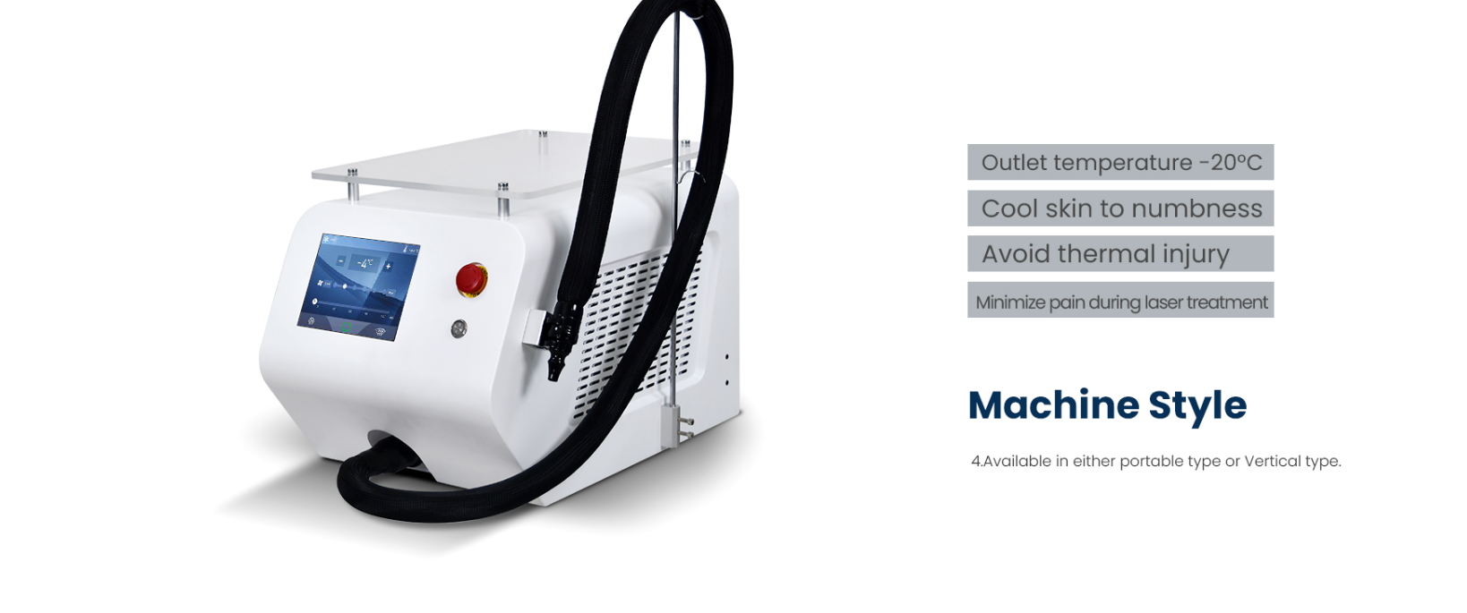 The Air Cooling Machine is a skin cooling system specifically designed for shallow laser skin surgeries and other aesthetic treatments. It effectively reduces laser-induced pain and thermal damage by cooling the epidermis, ensuring a more comfortable and safer experience for clients.