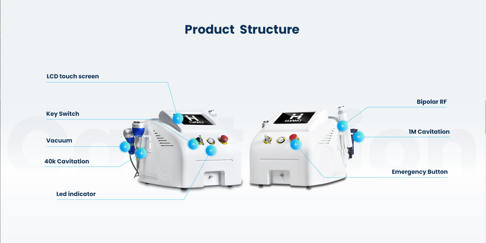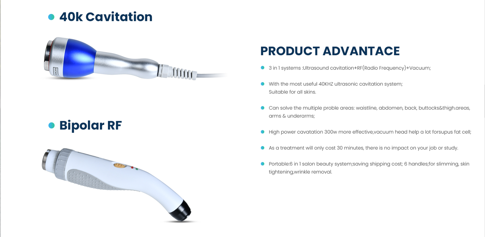Cavatation 300W, vacuum head help a lot for break down fat cell.